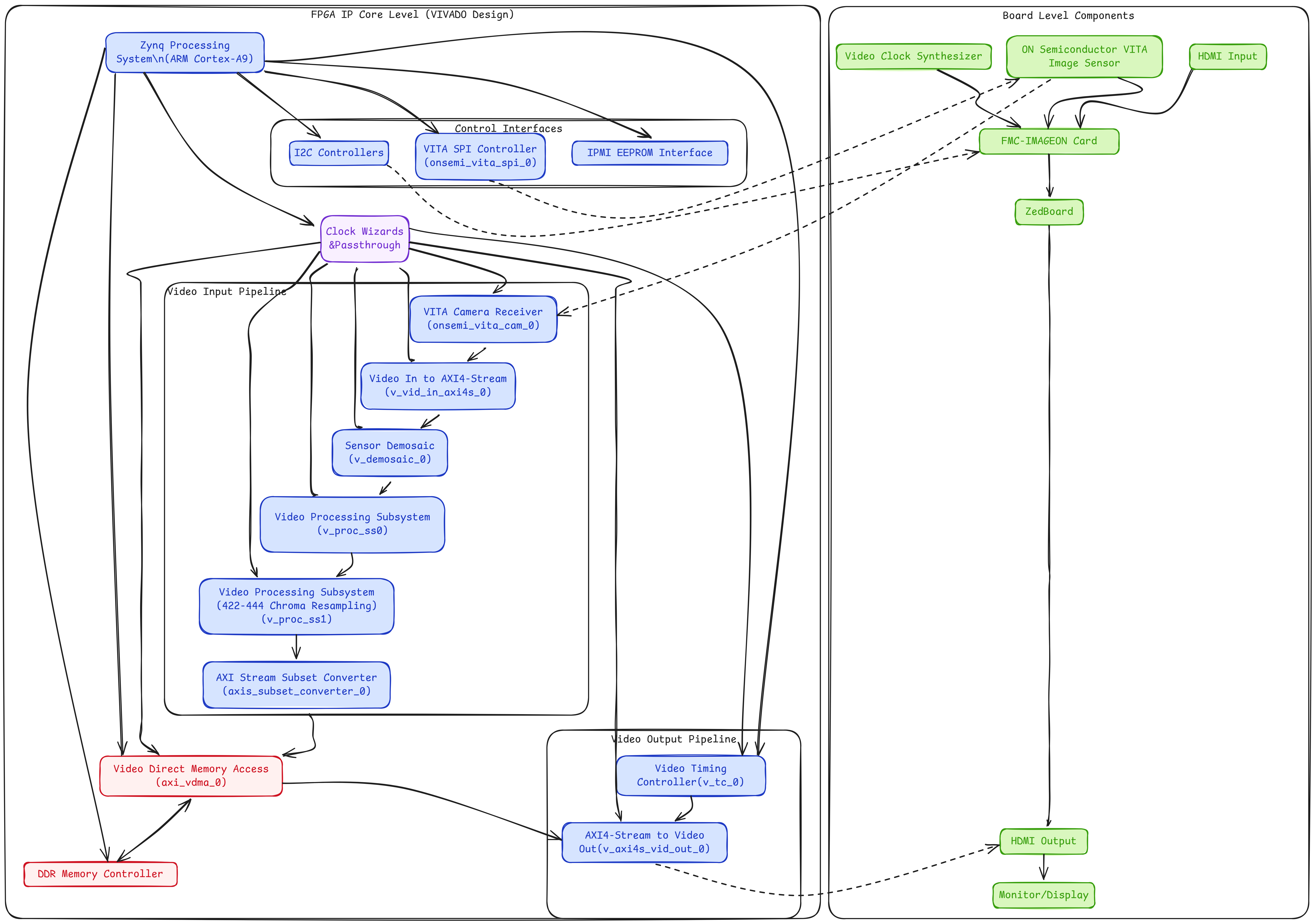 The following diagram illustrates the interconnection between the various modules in the system, both at the IP core level (i.e. the components in our VIVADO design) as well as the board level (i.e. the various chips that work together to connect the output video to the monitor).