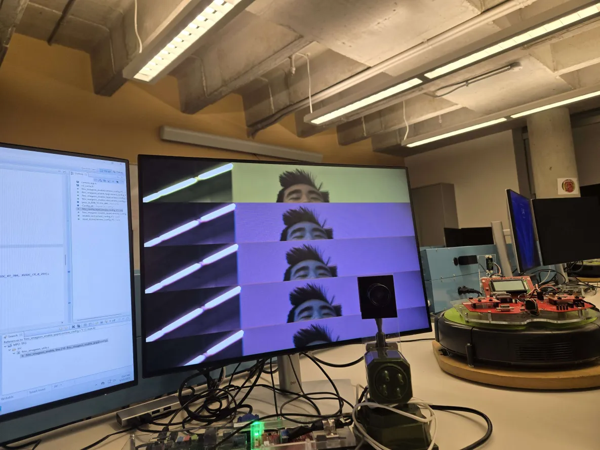 The digital zoom was implemented partially through the crop and scale capabilities of the fully fledged Video Processing Subsystem (v2.2) IP core. According to the embedded drivers for the IP, the VPSS has a zoom and scale core that can be used to perform a digital zoom by relaying display information in a user-specified window that can then be scaled to a desired dimension. To do this, I opted to add a separate core in addition to the two used in the original hardware pipeline for colour space conversion and chroma sampling, as I worried the additional operations could cause timing issues during the video processing. The final pipeline was as follows: Demosiac -> Zoom and Scale VPSS -> CSC VPSS -> 444:422 VPSS -> VDMA. Unfortunately, the driver documentation leaves something to be desired and there lacks an accessible example for this design. This resulted in an awfully heuristic design process, which ultimately produced a rather lackluster product. However, a product nonetheless. Although it still suffers from artifacts, a digital zoom of at most 85% of the original resolution was achieved before the video became distorted and corrupted. An example of the corrupted image can be seen below: